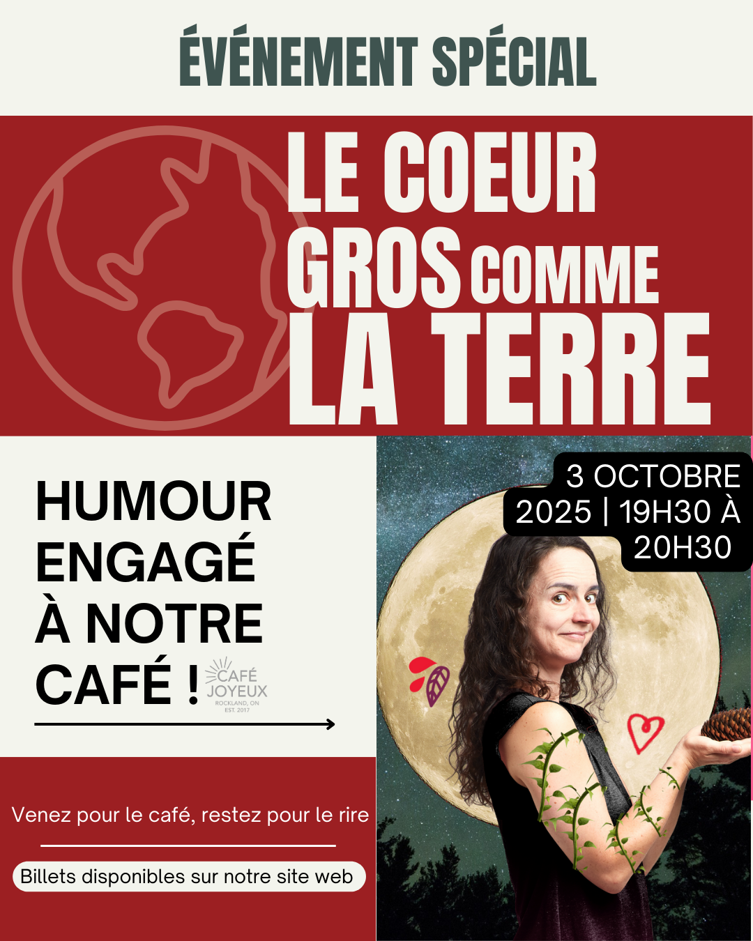 Rejoignez-nous pour une soirée unique d'humour et de chansons avec l'artiste Jacinthe Laforte et son spectacle, Le cœur gros comme la Terre. Venez rire, vous émerveiller et découvrir ce qui fait le charme d’un spectacle d’humour alchimique.